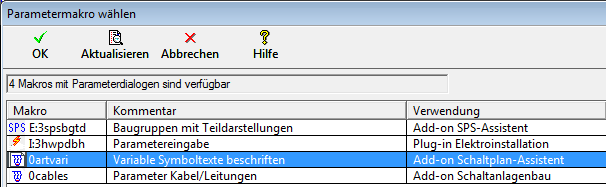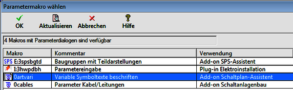 - Treesoft CAD ruft automatisch zur Beschriftung der Variablen-Symboltexte den Parameterdialog des gewählten Parametermakros auf. Die Funktion analysiert das Symbol und zeigt, entsprechend den über den Formatfilter eingestellten Optionen, die in dem Symbol hinterlegten Variablen-Symboltexte (beispielsweise Informationsvariablen) an. Die zur Beschriftung mit den technischen Informationen bzw. Wertangaben vorgesehenen Platzhalter (beispielsweise «Bereich») sind in dem Symbol in dem Textformat Informationsvariable hinterlegt. Die Beschriftung der Symboltexte erfolgt direkt in diesem Dialogfeld (siehe nachstehende Abbildung).